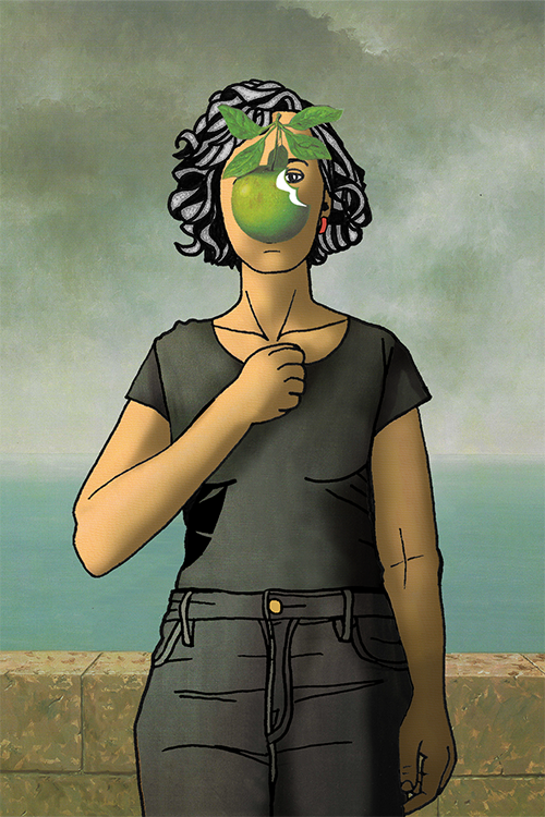 A reimagining of Magritte’s "The Son of Man", exploring misogyny and internalized guilt. The bitten apple is used as a symbol for the "sinner" and the sexist prejudice that often hides the real face of women. The strike to the chest represents the inner conflict caused when cultural misogyny has been internalized.