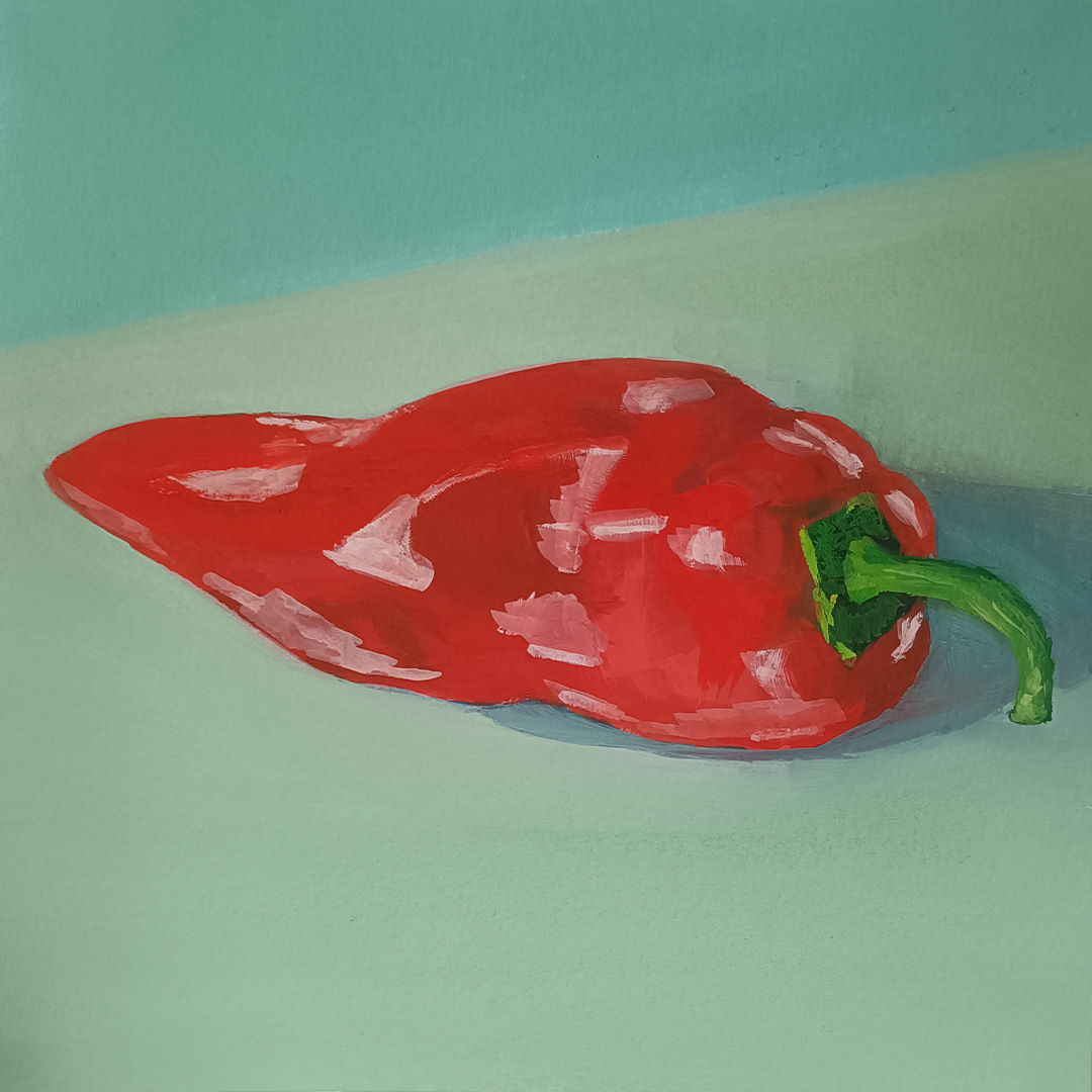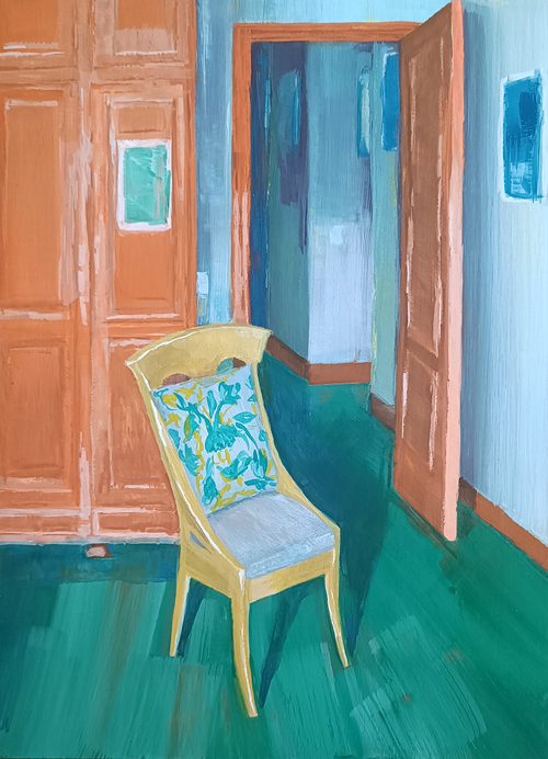 My recent paintings are studies in color, composition, and light. I explore these elements through interiors and still life using gouache on paper or wood panels, which allow for greater paint manipulation and experimentation with texture.